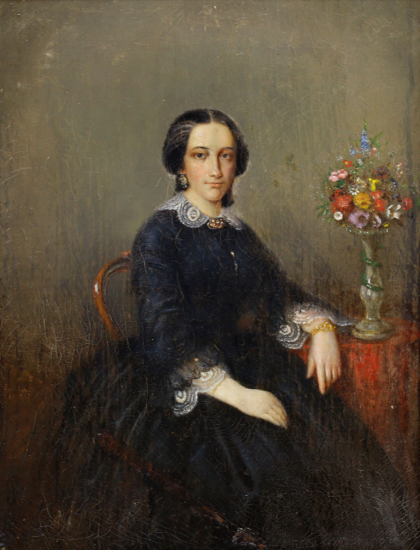 Bildnis einer sitzenden jungen Frau in schwarzer Kleidung. Oel auf Leinwand.